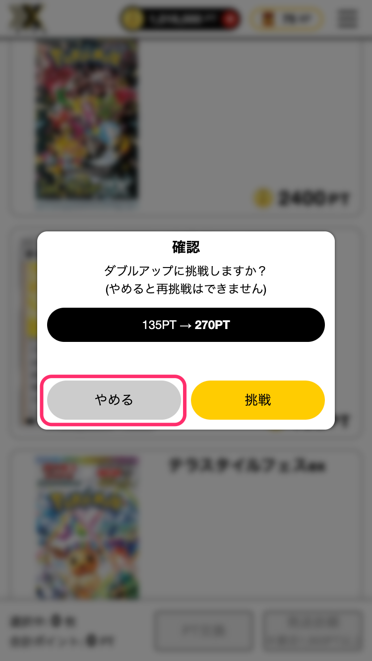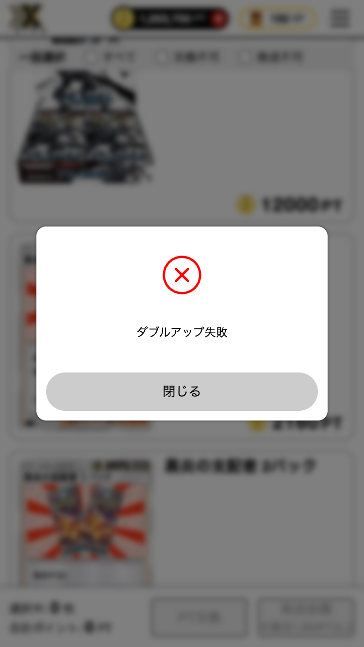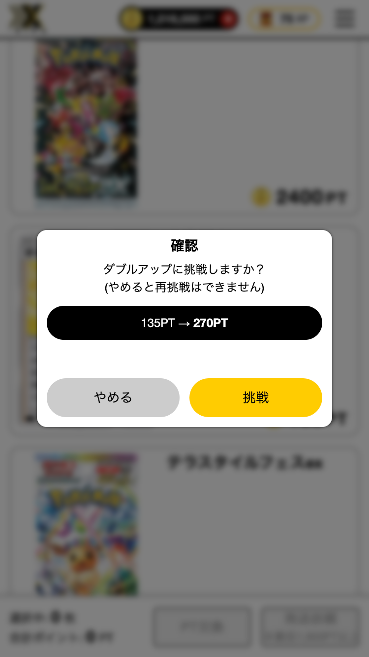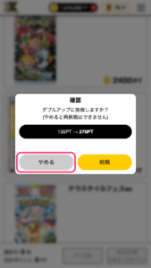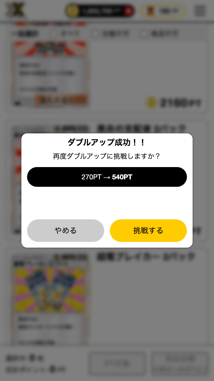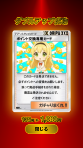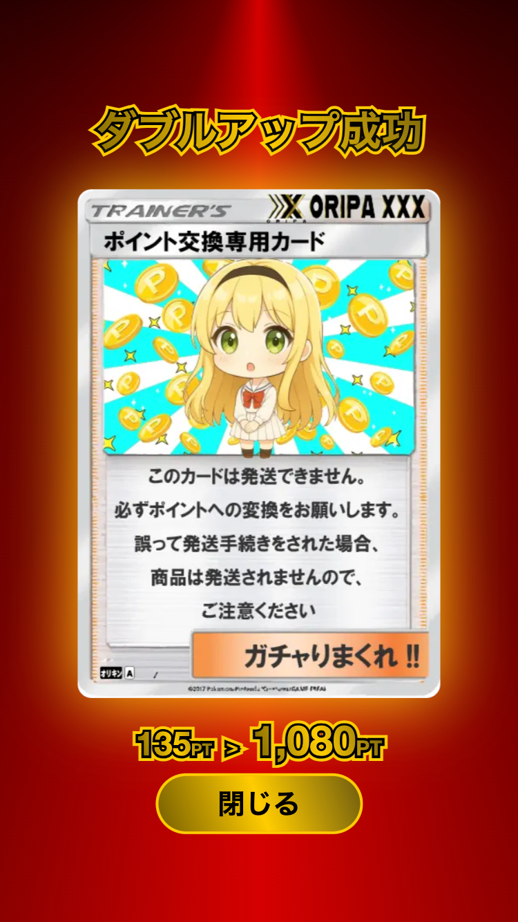 1)ガチャ結果画面、保有カード一覧画面からポイント交換をした際に一定確率で、ダブルアップチャンスの発生が通知されます