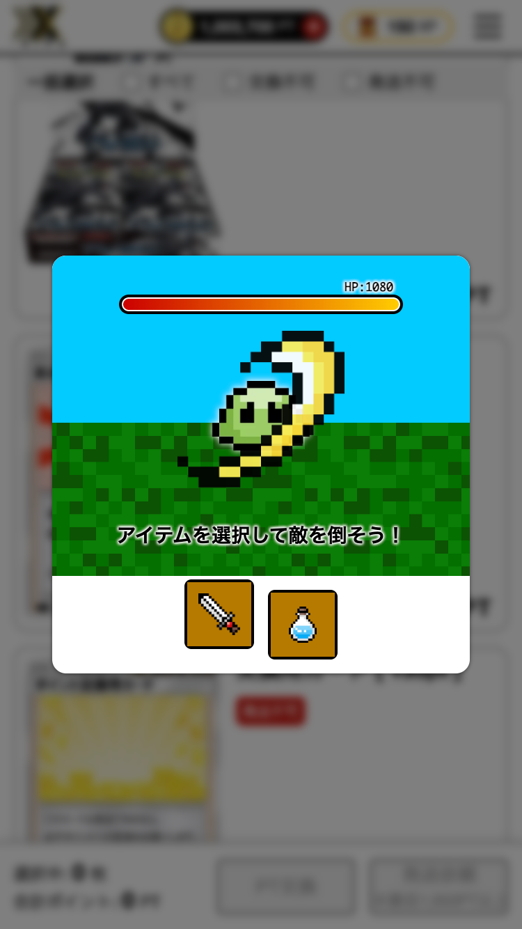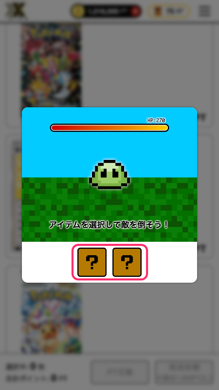 2−2)内容を確認して挑戦するを押すと、ミニゲームが表示されるので攻撃するアイテムを選択して、結果を待ちます